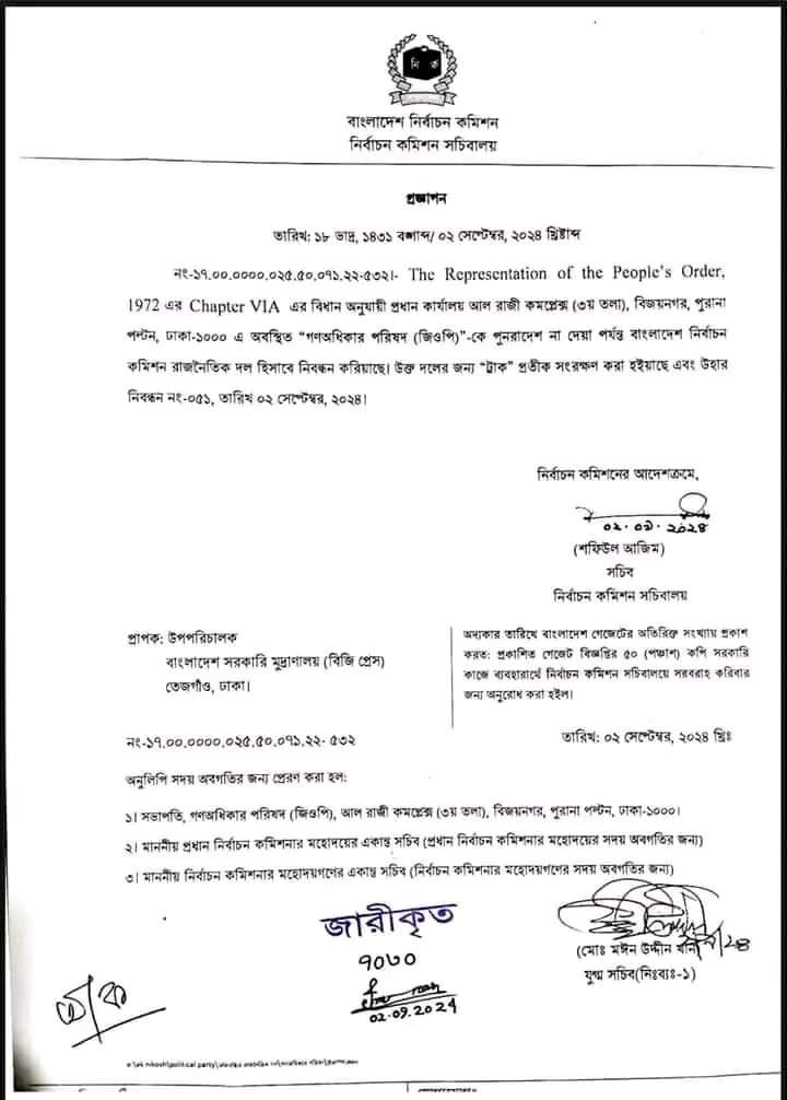 ইসি সচিব শফিউল আজিমের সই করা এ-সংক্রান্ত প্রজ্ঞাপনে বলা হয়, গণপ্রতিনিধিত্ব আদেশের বিধান অনুযায়ী গণ অধিকার পরিষদকে (জিওপি) পুনরাদেশ না দেওয়া পর্যন্ত বাংলাদেশ নির্বাচন কমিশন রাজনৈতিক দল হিসেবে নিবন্ধন করেছে। এই দলের জন্য ‘ট্রাক’ প্রতীক সংরক্ষণ করা হয়েছে। দলের নিবন্ধন নম্বর ৫১।