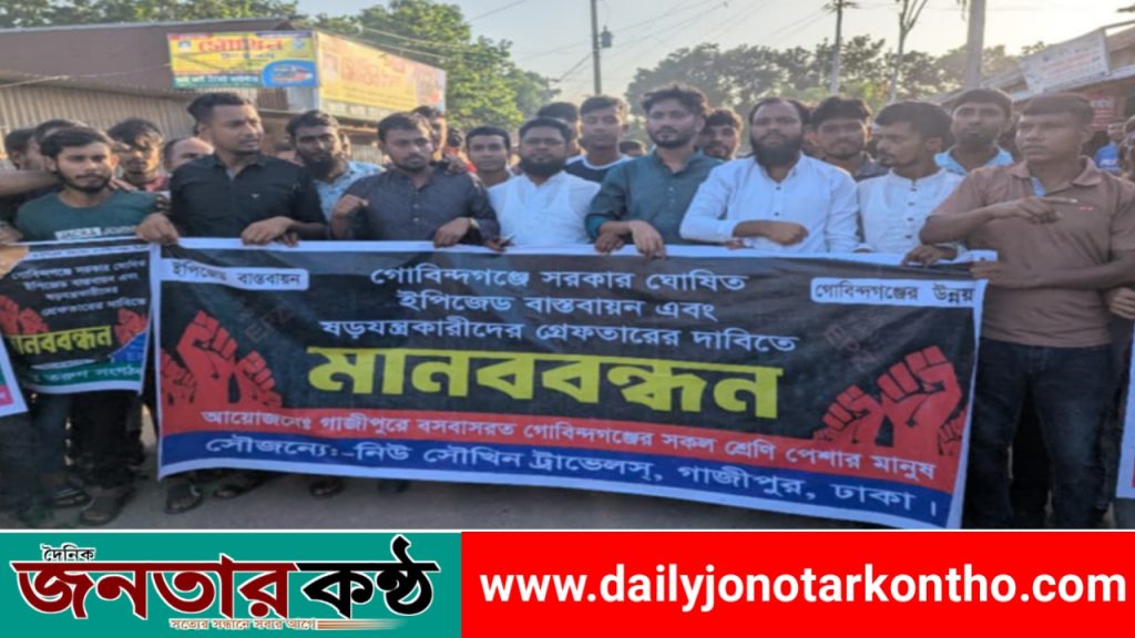 গাজীপুর সিটি করপোরেশনের ২২ নম্বর ওয়ার্ডের বাংলা বাজার এলাকায় এ মানববন্ধন অনুষ্ঠিত হয়। এতে গোবিন্দগঞ্জ থেকে আসা শিক্ষক, চাকরিজীবী, ব্যবসায়ী, শ্রমজীবী ও ছাত্রসহ বিভিন্ন পেশাজীবীরা স্বতঃস্ফূর্তভাবে অংশগ্রহণ করেন।