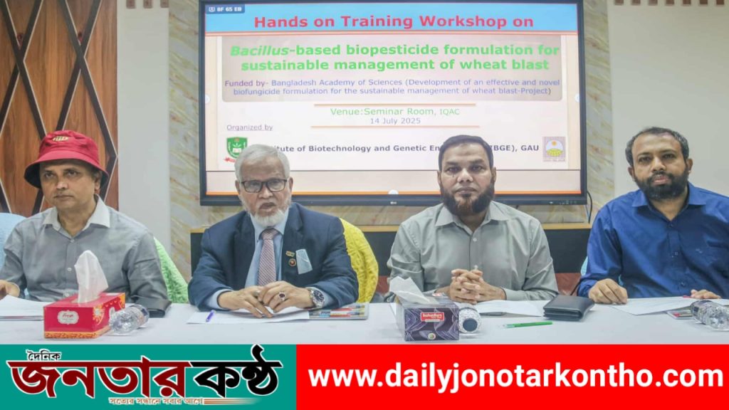 নজমুল হক, গাজীপুরঃ- গাজীপুর কৃষি বিশ্ববিদ্যালয়ে (গাকৃবি) ১৪ জুলাই দিনব্যাপী গমের ব্লাস্ট রোগের টেকসই ও পরিবেশবান্ধব ব্যবস্থাপনা নিশ্চিত করতে হাতে-কলমে প্রশিক্ষণ কর্মশালা অনুষ্ঠিত হয়েছে। কর্মশালার মূল প্রতিপাদ্য ছিল, “ব্যাসিলাস ভিত্তিক বালাইনাশক প্রস্তুতি ও ব্যবহার”। বিশ্ববিদ্যালয়ের ইনস্টিটিউট অব বায়োটেকনোলজি এন্ড জেনেটিক ইঞ্জিনিয়ারিং (আইবিজিই) এর উদ্দ্যোগে বাংলাদেশ বিজ্ঞান একাডেমি ও ইউএসডিএ এর অর্থায়নে এই প্রশিক্ষণ কর্মশালাটি বিশ্ববিদ্যালয়ের ইনস্টিটিউশনাল কোয়ালিটি অ্যাসিওরেন্স সেল (আইকিউএসি) এর সেমিনার কক্ষে অনুষ্ঠিত হয়। কর্মশালার প্রধান লক্ষ্য ছিল গমের ব্লাস্টের মতো ধ্বংসাত্মক ছত্রাকজনিত রোগ মোকাবিলায় রাসায়নিকের পরিবর্তে পরিবেশবান্ধব বালাইনাশক উৎপাদন ও ফর্মুলেশনের উপর প্রশিক্ষণ প্রদান করা। অংশগ্রহণকারীরা ব্যাসিলাস নামক উপকারী ব্যাকটেরিয়া ব্যবহার করে জৈব বালাইনাশক তৈরি ও মাঠ পর্যায়ে তার প্রয়োগ সম্পর্কে হাতে-কলমে প্রশিক্ষণ লাভ করেন। অনুষ্ঠানের প্রধান অতিথি হিসেবে উপস্থিত থেকে প্রশিক্ষণের উদ্বোধন করেন গাকৃবির উপাচার্য প্রফেসর ড. জিকেএম মোস্তাফিজুর রহমান। বিশেষ অতিথি ছিলেন বাংলাদেশ বিজ্ঞান একাডেমির ভাইস-প্রেসিডেন্ট প্রফেসর ড. জহুরুল করিম। সভাপতি হিসেবে উপস্থিত ছিলেন প্রকল্পের প্রধান গবেষক এবং আইবিজিই এর সাবেক পরিচালক প্রফেসর ড. তোফাজ্জল ইসলাম। উক্ত প্রশিক্ষণ কর্মশালায় আইকিউএসি এর পরিচালক প্রফেসর ড. নাসরীন আক্তার আইভী, প্রফেসর ড. মোঃ মোর্শেদুর রহমান, আইবিজিই এর সাবেক পরিচালক প্রফেসর ড. মোঃ মাহবুবুর রহমান সহ বিভিন্ন অনুষদের শিক্ষক, আইবিজিই-এর শিক্ষার্থী, বিএআরআই ও ব্রি থেকে আগত আমন্ত্রিত বিজ্ঞানী ও বিভিন্ন ইনডাস্ট্রির প্রতিনিধিবৃন্দ অংশগ্রহণ করেন। উদ্বোধনী অনুষ্ঠানে স্বাগত বক্তব্য প্রদান করেন আইবিজিই’র পরিচালক প্রফেসর ড. শাহ্ মোহাম্মদ নাঈমুল ইসলাম। প্রধান অতিথির বক্তব্যে উপাচার্য প্রফেসর ড. জিকেএম মোস্তাফিজুর রহমান বলেন, “গমের ব্লাস্ট একটি ভয়াবহ রোগ যা প্রতিবছর ফসলের বিপুল ক্ষতি করে। রাসায়নিকের বিকল্প হিসেবে ব্যাসিলাস-ভিত্তিক জৈব প্রযুক্তি নিরাপদ, সাশ্রয়ী ও পরিবেশবান্ধব সমাধান হিসেবে কার্যকর ভূমিকা রাখতে পারে।” বিশেষ অতিথি ড. জহুরুল করিম বলেন, “কৃষক পর্যায়ে জৈব বালাইনাশক তৈরির দক্ষতা পৌঁছে দিতে পারলে গম চাষে একটি টেকসই পরিবর্তন আসবে। আমাদের লক্ষ্য কৃষকের জন্য বাস্তবসম্মত ও উপযোগী সমাধান নিশ্চিত করা। তিনি আরও বলেন, অণুজীবের শক্তি ব্যবহারের মাধ্যমে উন্নত দেশগুলো অর্থনৈতিক সমৃদ্ধি অর্জন করলেও বাংলাদেশ সহ উন্নয়নশীল দেশসমূহ এক্ষেত্রে পিছিয়ে রয়েছে। টেকসই কৃষি উন্নয়নের জ