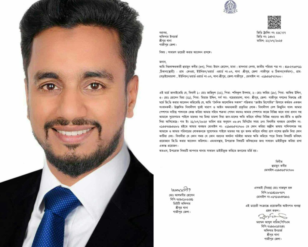 জাহাঙ্গীর আলম, স্টাফ রিপোর্টারঃ- গাজীপুরের শ্রীপুরে হুমায়ুন কবির (৩৭) নামের এক সাংবাদিককে প্রাণনাশের হুমকি দেওয়ার অভিযোগ উঠেছে। পেশাগত দায়িত্ব পালনের সময় বিরোধের জেরে একাধিকবার হুমকির শিকার হওয়ার পর (২২’শে জুলাই ২০২৫) মঙ্গলবার রাতে তিনি শ্রীপুর থানায় একটি সাধারণ ডায়েরি (জিডি) করেছেন।