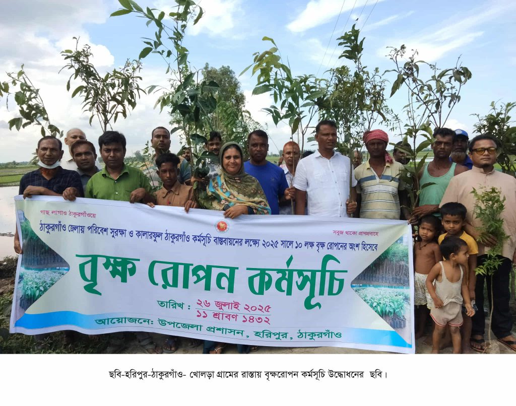 জহুরুল ইসলাম (জীবন)  হরিপুর (ঠাকুরগাঁও) প্রতিনিধিঃ “গাছ লাগাও ঠাকুরগাঁওয়ে, সবুজ থাকো প্রাণপ্রবাহে” এই প্রতি পাদ্যকে সামনে রেখে ঠাকুরগাঁওয়ের হরিপুরে বৃক্ষ রোপন কর্মসূচির উদ্ধোধন করা হয়েছে। শনিবার (২৬ জুলাই) হরিপুরে উপজেলা প্রশাসনের আয়োজনে বিকালে হরিপুর উপজেলার ৫নং সদর ইউনিয়নের খোলড়া গ্রামের রাস্তায় বৃক্ষ রোপন কর্মসূচির উদ্ধোধন করা হয়। এ সময় উপস্থিত ছিলেন হরিপুর উপজেলার এস,এফ পিসি অফিসের ভারপ্রাপ্ত অফিসার মীর নজরুল ইসলাম, হরিপুর ইউনিয়র সচিব, ইউনিয়নের নারী সদস্য পারুল , সোহেল,শহিদুল ইসলাম,রাফসান প্রমুখ।  জানা যায় ঠাকুরগাঁও জেলা প্রশাসকের উদ্দেগেও জেলা পরিষদের অর্থয়ানে ঠাকুরগাঁও জেলায় পরিবেশ সুরক্ষা ও কালারফুল  ঠাকুগাঁও কর্মসূচি বাস্তবায়নের লক্ষে ২০২৫ সালে ১০ লক্ষ বৃক্ষ রোপনের অংশ  হিসেবে হরিপুর উপজেলার ৬ টি ইউনিয়নে এক কিলোমিটার করে রাস্তায় ফলদ,বনজ,ঔষধী সহ ১০ প্রজাতির বিভিন্ন বৃক্ষের চারা রোপন করা হবে।