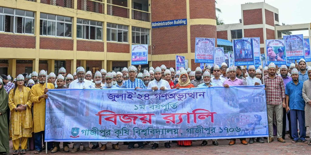গাজীপুর প্রতিনিধিঃ গাজীপুর কৃষি বিশ্ববিদ্যালয়ে (গাকৃবি) ৫ আগস্ট মঙ্গলবার আনন্দ, আবেগ ও শ্রদ্ধার সাথে উদযাপিত হলো জুলাই গণঅভ্যুত্থান দিবস। দিবসে আয়োজিত হয় জুলাই’২৪ গণঅভ্যুত্থান স্মরণে দোয়া, আলোচনা সভা এবং সাংস্কৃতিক সন্ধ্যার। এতে জুলাই গণঅভ্যুত্থানের বিজয়কে ধারণ করে রাখার জন্য গাকৃবির প্রশাসনিক ভবনের সম্মুখ চত্বরকে জুলাই ৩৬ চত্বর’ ঘোষণা দিয়েছেন উপাচার্য প্রফেসর ড. জিকেএম মোস্তাফিজুর রহমান। এ গণঅভ্যুত্থান দিবসের শুভ সূচনা হয় বিশ্ববিদ্যালয়ের মেডিক্যাল সেন্টার এ রক্তদান ও রক্তের গ্রুপ নির্ণয় কর্মসূচির মাধ্যমে। পরে সকালে এক বর্ণাঢ্য বিজয় র্যালি অনুষ্ঠিত হয়, যেখানে গাকৃবির ভাইস-চ্যান্সেলর প্রফেসর ড. জিকেএম মোস্তাফিজুর রহমান এবং অনুষ্ঠানের প্রধান অতিথি বাংলাদেশ বিশ্ববিদ্যালয় মঞ্জুরী কমিশনের সদস্য প্রফেসর ড. মোহাম্মদ তানজীমউদ্দিন খান এর নেতৃত্বে গাকৃবির শিক্ষক, শিক্ষার্থী, কর্মকর্তা ও কর্মচারীরা একাত্ম হয়ে অংশ নেন। প্ল্যাকার্ড আর স্লোগানে মুখরিত সেই র্যালি মুহূর্তে পরিণত হয় প্রতিরোধের প্রতীকে। এরপর নতুন কৃষি অনুষদের নিচে আয়োজিত হয় স্থিরচিত্র প্রদর্শনী, যেখানে ফুটে ওঠে জুলাই ‘২৪ এর প্রতিটি সাহসী মুহূর্ত। বিশ্ববিদ্যালয়ের বেগম সুফিয়া কামাল অডিটোরিয়ামে অনুষ্ঠিত হয়ে গণঅভ্যুত্থান স্মরণে আলোচনাসভা। মহতী এ আলোচনাসভায় সভাপতির আসন অলংকৃত করেন গাকৃবির উপাচার্য প্রফেসর ড. জিকেএম মোস্তাফিজুর রহমান। পরিচালক (ছাত্র-কল্যাণ) প্রফেসর ড. মোহাম্মদ শরীফ রায়হানের সঞ্চালনায় সভায় প্রধান অতিথি ছিলেন প্রফেসর ড. মোহাম্মদ তানজীমউদ্দিন খান এবং বিশেষ অতিথি ছিলেন গাকৃবির ট্রেজারার প্রফেসর ড. মোঃ সফিউল ইসলাম আফ্রাদ। এছাড়া সভায় উপস্থিত ছিলেন বিশ্ববিদ্যালয়ের বিভিন্ন অনুষদীয় ডিন, রেজিস্ট্রার, পরিচালক, প্রক্টর, শিক্ষক-শিক্ষার্থী, প্রভোস্ট এবং শিক্ষকবৃন্দসহ কর্মকর্তা-কর্মচারীবৃন্দ। আলোচনার শুরুতেই জুলাই শহিদদের আত্মার মাগফেরাত কামনা করে বিশেষ দোয়া অনুষ্ঠিত হয়। পরে আলোচনা পর্বে স্বাগত বক্তব্য প্রদান করেন বিশ্ববিদ্যালয়ের রেজিস্ট্রার মোঃ আবদুল্লাহ্ মৃধা। এরপর বিশ্ববিদ্যালয়ের অডিটোরিয়ামে প্রদর্শিত হয় গাকৃবি কর্তৃক নির্মিত জুলাই’২৪ এর উপর একটি প্রামাণ্যচিত্র, যা মনে করিয়ে দেয় সেই ভয়াল দিনগুলোর সত্য, ইতিহাসের অবিস্মরণীয় মুহূর্তসমূহ। আলোচনা পর্বে গাকৃবি শিক্ষার্থীদের পক্ষ থেকে বক্তব্য প্রদান করেন হাফসা শারমীন এবং সাজ্জাতুল ইসলাম শাওন, কর্মচারী ও কর্মকর্তাগণের পক্ষে যথাক্রমে বক্তব্য দেন দুলাল হোসেন এবং আবু হানিফ পালোয়ান। অন্যদিকে শিক্ষক সমিতির পক্ষ থেকে প্রফেসর ড. মোঃ আবু আশরাফ খান ও প্রফেসর ড. মো