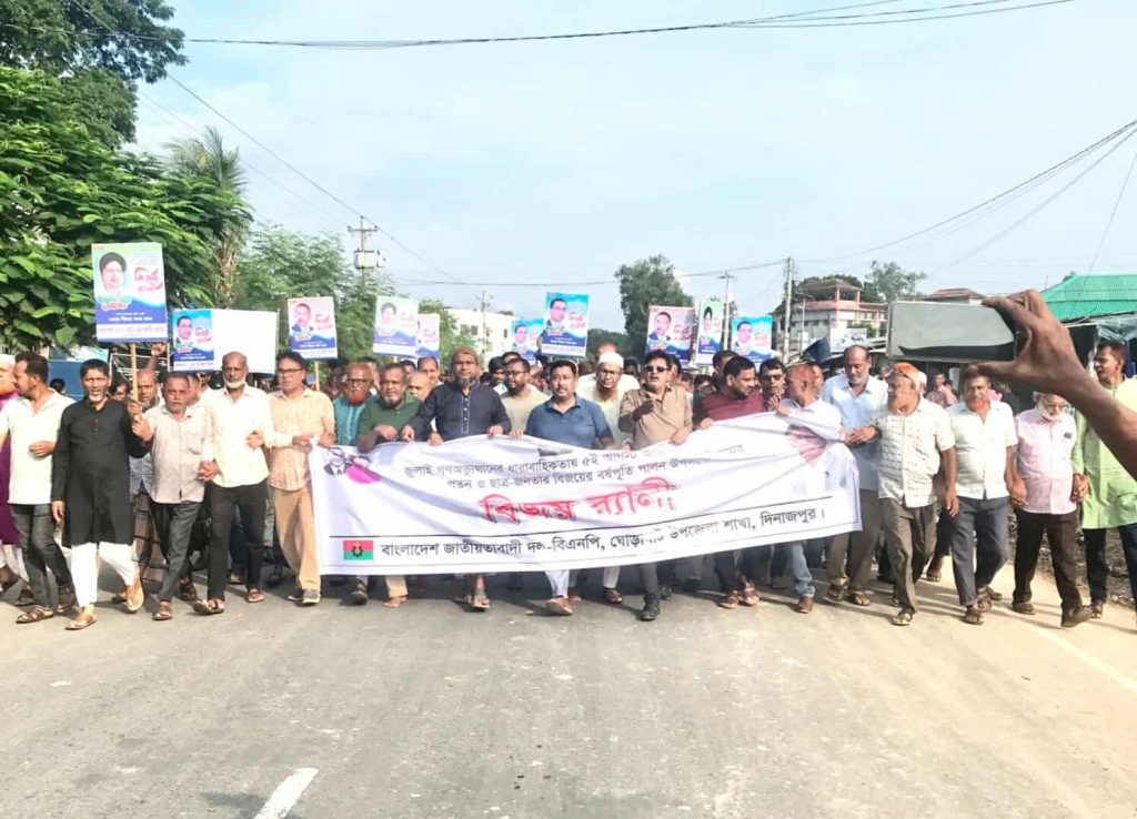 দিনাজপুরের ঘোড়াঘাটে ৩৬ জুলাই গণঅভ্যুত্থান দিবসের ১ বছর পূর্ণ হওয়ায় বিভিন্ন সংগঠনের পক্ষ থেকে বিজয় র‍্যালি ও গণমিছিল অনুষ্ঠিত হয়েছে।মঙ্গলবার (৫ আগস্ট) বিকেল ৫টায় ঘোড়াঘাট উপজেলা বিএনপি ও তাদের অঙ্গ-সহযোগী সংগঠনের আয়োজনে এক বিজয় র‍্যালি অনুষ্ঠিত হয়। র‍্যালি শেষে এক সংক্ষিপ্ত সমাবেশে বক্তব্য রাখেন, দিনাজপুর জেলা বিএনপির সহ-সভাপতি ও উপজেলা বিএনপির সভাপতি শাহ মো. শামীম হোসেন চৌধুরী, সাধারণ সম্পাদক আবু সাঈদ মিয়া, সাংগঠনিক সম্পাদক মাহফুজার রহমান লাবলু সহ আরও অনেকে। এ সময় উপজেলা বিএনপি ও অঙ্গ সংগঠনের নেতৃবৃন্দ সহ হাজার হাজার নেতাকর্মী উপস্থিত ছিলেন।এর পূর্বে সন্ধ্যা সাড়ে ৬ টায় জাতীয় নাগরিক কমিটি (এনসিপি), বিকেল ৪টার পৌর বিএনপি, বিকেল ৩টায় ইসলামী আন্দোলন বাংলাদেশ ও সকাল ১০টায় বাংলাদেশ জামায়াতে ইসলামী ঘোড়াঘাট উপজেলা শাখার আয়োজনে গণমিছিল অনুষ্ঠিত হয়। মিছিলের আগে উপজেলা জামায়াতে ইসলামীর আমীর মোফাখখায়ের ইসলাম মোল্লার সভাপতিত্বে ও সেক্রেটারী ইমরান হোসেনের সঞ্চালনায় এক সংক্ষিপ্ত সমাবেশে বক্তব্য রাখেন, বাংলাদেশ জামায়াতে ইসলামীর কেন্দ্রীয় মজলিসে শুরা সদস্য আনোয়ারুল ইসলাম, দিনাজপুর জেলা জামায়াতে কর্মপরিষদ সদস্য ও উপজেলা পরিষদের সাবেক ভাইস চেয়ারম্যান আলমগীর হোসেন প্রমুখ।