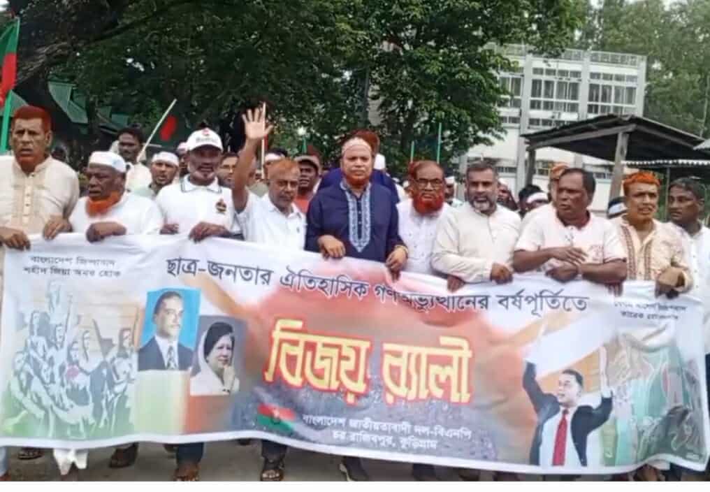 শহিদুল্লাহ ফরাজি কুড়িগ্রাম প্রতিনিধিঃ- ৫ আগস্ট আওয়ামী ফ্যাসিবাদের পতন ও ছাত্র-জনতার বিজয়ের বর্ষপূর্তি উপলক্ষে রাজিব পুর উপজেলার কোদালকাটি ও মোহনগঞ্জ ইউনিয়ন বিএনপির উদ্যোগে এক বর্ণাঢ্য বিজয় র্যালি অনুষ্ঠিত হয়েছে।