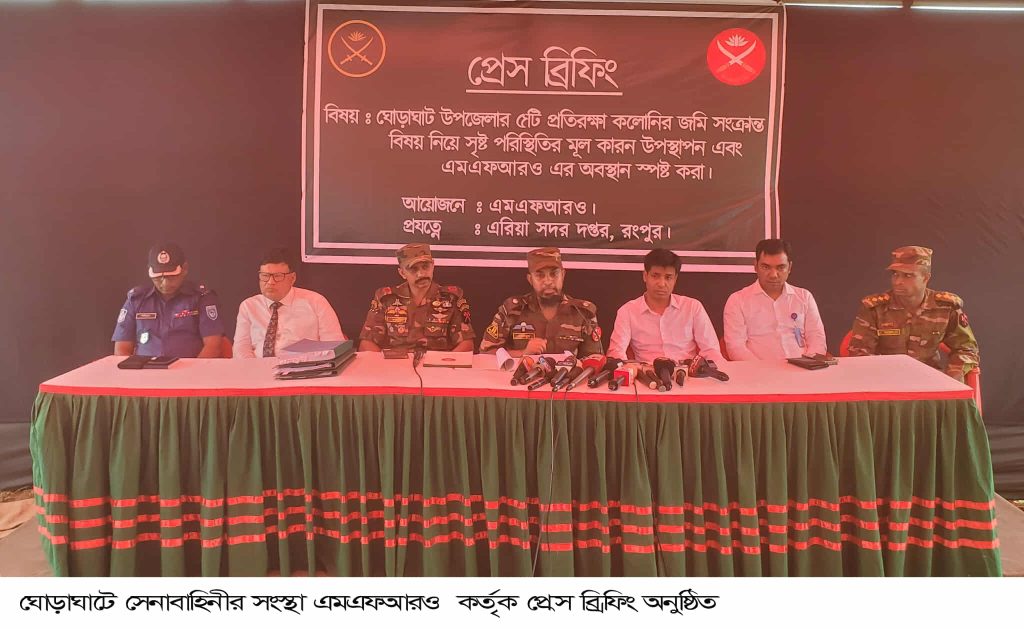 দিনাজপুরের ঘোড়াঘাট উপজেলার ৫টি প্রতিরক্ষা কলোনীর জমি সংক্রান্ত বিষয় নিয়ে সৃষ্ট পরিস্থিতির মূল কারণ উপস্থাপন এমএফআরও এর অবস্থান স্পষ্ট করা বিষয়ে গণমাধ্যম নিয়ে প্রেস ব্রিফিং অনুষ্ঠিত হয়েছে।আজ বুধবার সকাল ১২ টায় উপজেলার হিলির মোড় সেনা ক্যাম্পে এরিয়া সদর দপ্তর রংপুরের এমএফআরও (মিলিটারী ফ্যামিলি রিহ্যাবলিটেশন অফিস) আয়োজনে অনুষ্ঠিত প্রেস ব্রিফিংয়ে উপস্থাপন করেন, এমএফআরও কর্মকর্তা মেজর নাজমুল হায়দার।প্রেস ব্রিফিংয়ে তিনি লিখিত বক্তব্যে বলেন,উক্ত ৫টি প্রতিরক্ষা কলোনীর জমি সরকারীভাবে প্রতিরক্ষা মন্ত্রনালয়ের অধীন এবং কোনভাবেই ব্যক্তি মালিকানাধীন নয়। এসব সরকারী জমি ৩ বাহিনীর (বিমান, নৌ, সেনা) কল্যাণের জন্য নিয়োজিত একটি সরকারী সংস্থা যা সম্পূর্ণ আইনানুগভাবে এবং প্রতিষ্ঠিত নিয়ম নীতিমালার মধ্য থেকে তার কার্যক্রম পরিচালনা করছে। আইনের ব্যত্যয় করার কিংবা আইনের বাইরে এমএফআরও এর কাজ পরিচালনা করার কোন তথ্য কিংবা প্রমাণ এখন পর্যন্ত ৫ কলোনীর পক্ষ থেকে কেউ কোথাও উপস্থাপন করতে পারেনি। কিছু দালাল ও স্বার্থানে¦ষী মহল ৫ কলোনীর ১৩৭৫ একর জমি নিয়ে সাধারণ মানুষকে মিথ্যা তথ্য দিয়ে প্রতিরক্ষা মন্ত্রনালয়ের জমিতে বসতি স্থাপনের প্রলোভন দেখাচ্ছে। এ ধরনের কর্মকান্ডে জড়িতদের চিহ্নিত করে আইনগত ব্যবস্থা নেওয়া হবে। তাদের বেশির ভাগ অভিযোগ ভিত্তিহীন এবং বানোয়াট বলেন তিনি। তিনি সবাইকে সচেতন এবং দায়িত্বশীল আচরণের আহবান জানান।প্রেস ব্রিফিং উপস্থাপনকালে উপস্থিত ছিলেন, উপজেলা নির্বাহী কর্মকর্তা (ইউএনও) রফিকুল ইসলাম, এসি ল্যান্ড আব্দুল আল মামুন কাওছার শেখ, ২৫ বীর সার্পোট ব্যাটেলিয়নের উপ অধিনায়ক মেজর নূর এ শহীদ ফারাবী, সরকারী কৌসুলী (জিপি) এ্যাডভোকেট মোল্লা মোহাম্মদ সাখাওয়াত হোসেন, ওসি (তদন্ত) শহিদুল ইসলাম প্রমুখ।