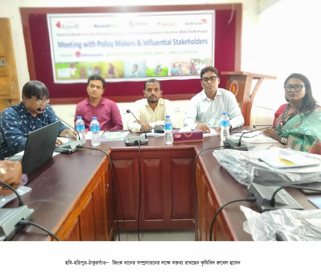 ঠাকুরগাঁও জেলায় আন্তর্জাতিক খাদ্য নীতি গবেষণা ইনস্টিটিউট হারভেস্টপ্লাস পোগ্রামের রিঅ্যাক্টস-ইন প্রকল্পের আয়োজনে জিংক ধানের সম্প্রসারণে নীতি নির্ধারন ও প্রকল্পের অংশীদারগনের নিয়ে হরিপুর উপজেলায় মতবিনিময় সভা অনুষ্ঠিত হয়েছে। সোমবার(১১ আগস্ট) দুপুরে আরডিআর এস বাংলাদেশ এর আয়োজনে উপজেলা পরিষদের সভা কক্ষে উপজেলা কুষি অফিসার কৃষিবিদ রুবেল হুসেনের সভাপতিত্বি সভা অনুষ্ঠিত হয়। এতে বক্তব্য রাখেন হরিপুর উপজেলা কৃষি অফিসের অতিরিক্ত কৃষি অফিসার কৃষিবিদ মানস কুমার, হারভেস্টপ্লাস এর প্রোগ্রাম ম্যানেজার কৃষিবিদ মজিবর রহমান,প্রজেক্ট ম্যানেজার কৃষিবিদ শাহিনুল কবির, ইএসডিও‘র এপিসি কৃষিবিদ আসরাফুল আলম,রিএক্ট-ইন প্রজেক্টের টেকনিক্যাল অফিসার মোজাম্মেল শেখ,ওয়াল ভিশনের কোঅডিনেটন রুমা পারভিন, মাধ্যমিক শিক্ষা অফিসার রাইহানুল ইসলাম সিঞা প্রমুখ। সভায় সরকারি বিভিন্ন দপ্তরের অফিসার,স্কুল কলেজের শিক্ষক, ইমাম, পুরোহিত, সাংবাদিক, ব্যাবসায়ী সহ ৪৫ জন উপস্থিত ছিলেন।