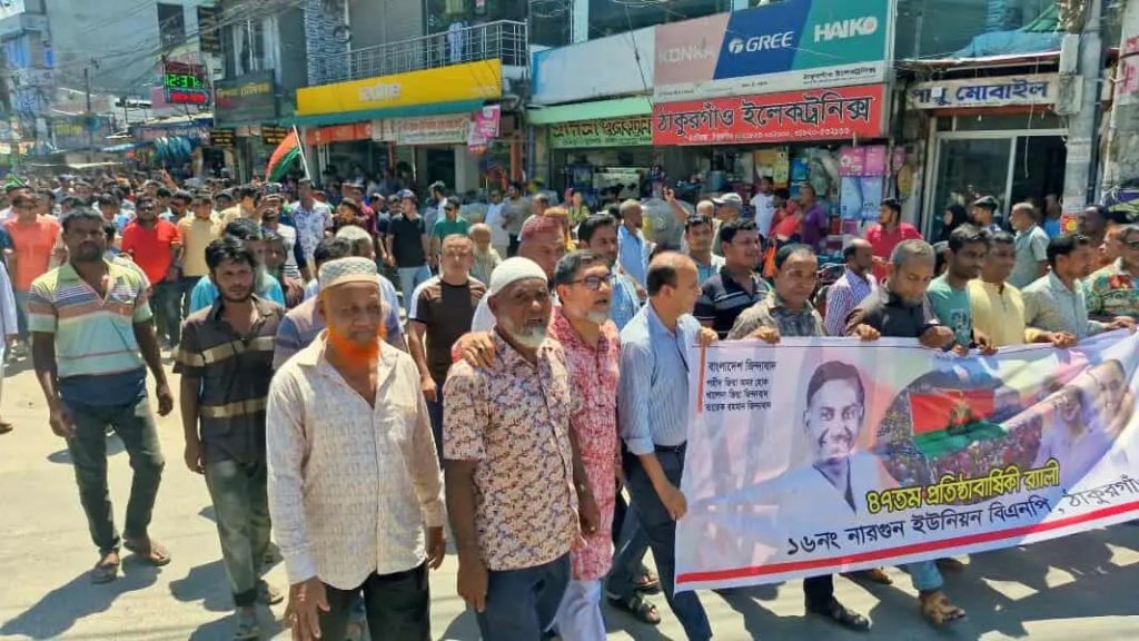 বাংলাদেশ জাতীয়তাবাদী দল বিএনপির ৪৭তম প্রতিষ্ঠাবার্ষিকী উপলক্ষে ঠাকুরগাঁওয়ে আনন্দ শোভাযাত্রা ও আলোচনা সভা করেছেন দলটির নেতাকর্মীরা।