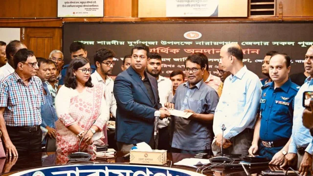 এর আগে জেলা প্রশাসক মোহাম্মদ জাহিদুল ইসলাম মিঞা জেলা পরিষদের উদ্যোগে আসন্ন শারদীয় দুর্গাপূজা উপলক্ষে নারায়ণগঞ্জের ২২৪টি পূজামণ্ডপের প্রত্যেকটিতে আর্থিক অনুদান প্রদান করেন।