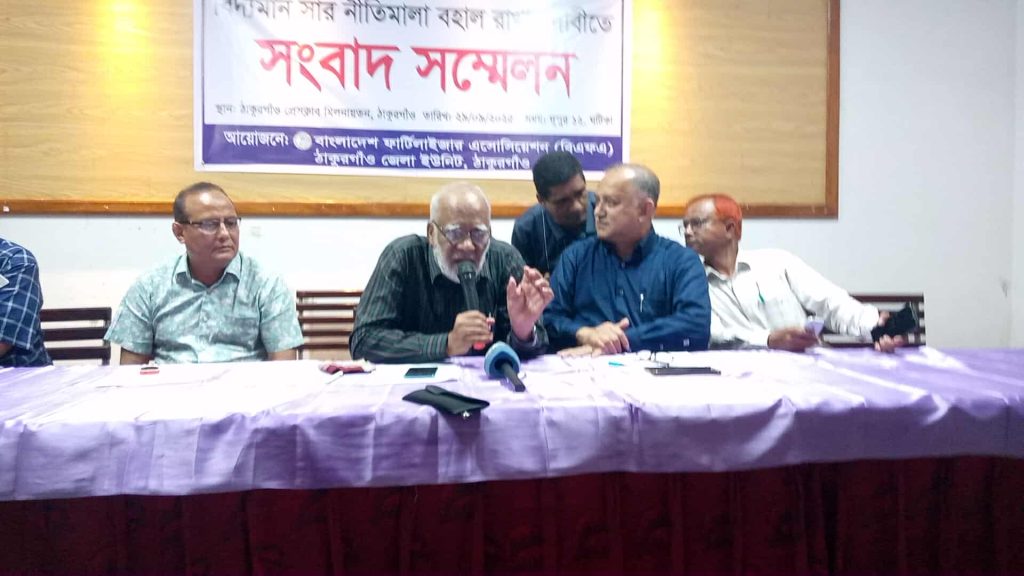 ঠাকুরগাঁওয়ে বিদ্যমান সার নীতিমালা বহাল রাখার দাবিতে সংবাদ সম্মেলন করেছে বাংলাদেশ ফার্টিলাইজার অ্যাসোসিয়েশন (বিএফএ) ঠাকুরগাঁও জেলা ইউনিট।
