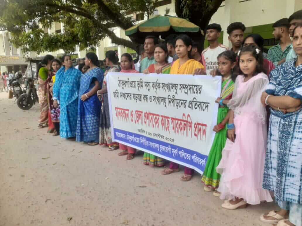 ঠাকুরগাঁওয়ে একটি সংখ্যালঘু পরিবারের জমি দখলের অভিযোগ ও হামলার প্রতিবাদে মানববন্ধন কর্মসূচি পালিত হয়েছে। একই সাথে, ভুক্তভোগী পরিবার জমি দখলকারীদের বিরুদ্ধে আইনানুগ ব্যবস্থা গ্রহণের দাবিতে জেলা প্রশাসক (ডিসি) বরাবর স্মারকলিপি প্রদান করেছে।