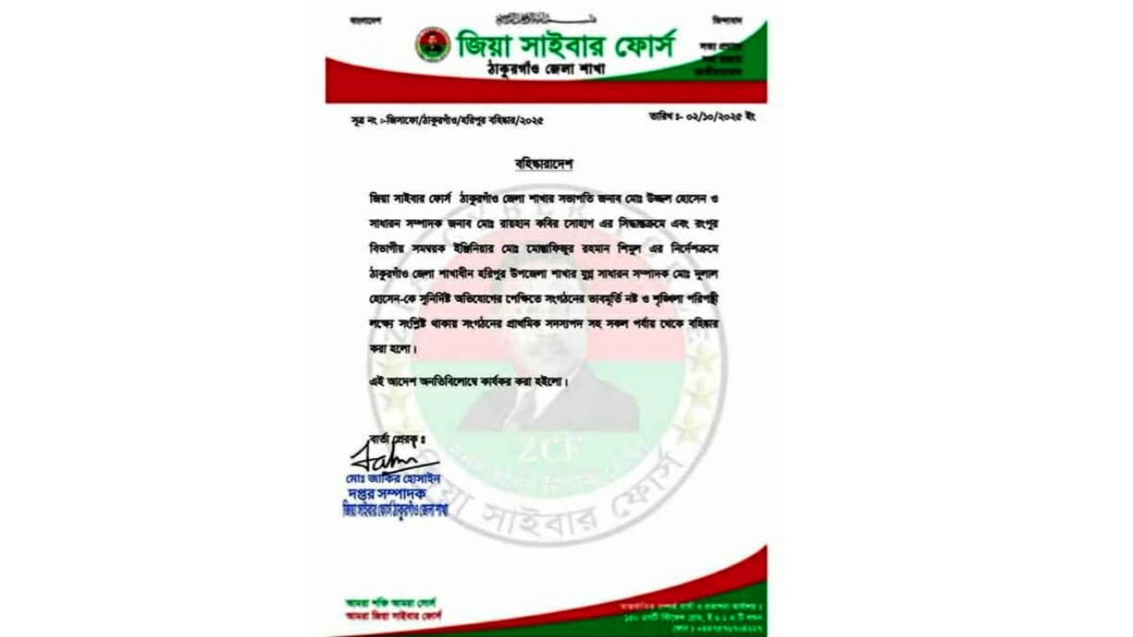 বৃহস্পতিবার (২ অক্টোবর) রাতে ঠাকুরগাঁও জেলা জিয়া সাইবার ফোর্স কমিটির দপ্তর সম্পাদক জাকির হোসেন স্বাক্ষরিত এক প্রেস বিজ্ঞপ্তিতে এ তথ্য জানানো হয়।