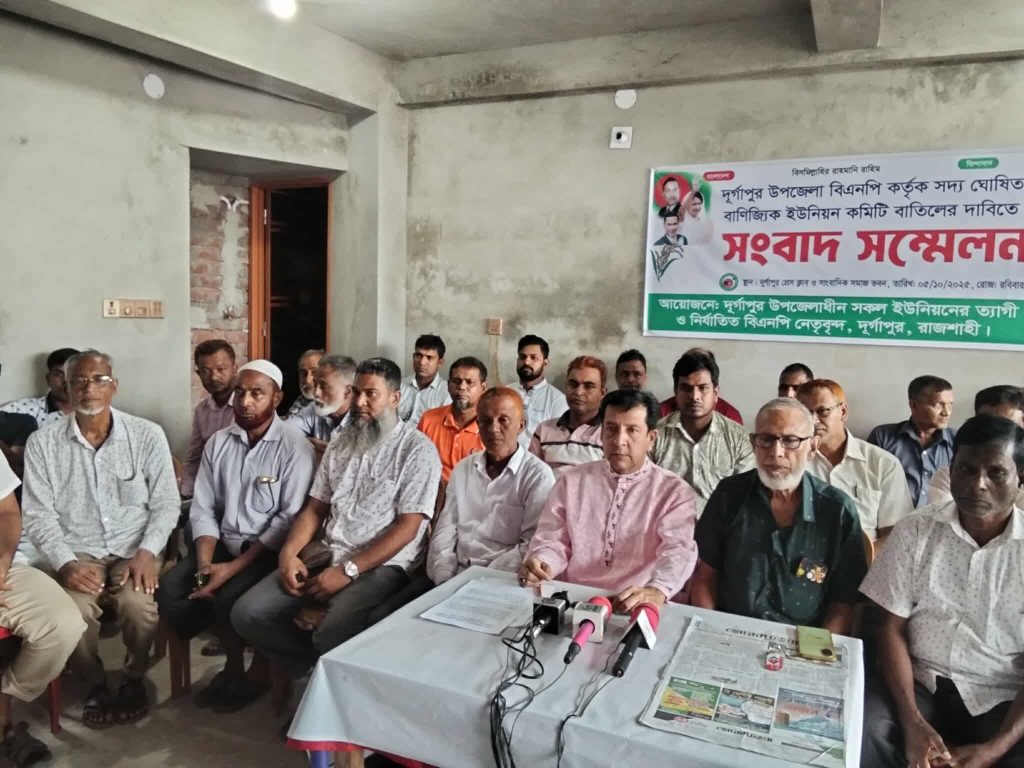 রাজশাহীর দুর্গাপুরে সদ্য ঘোষিত বিএনপির ছয়টি ইউনিয়নের বাণিজ্যিক কমিটি বাতিলের দাবি জানিয়ে সংবাদ সম্মেলন করা হয়েছে।