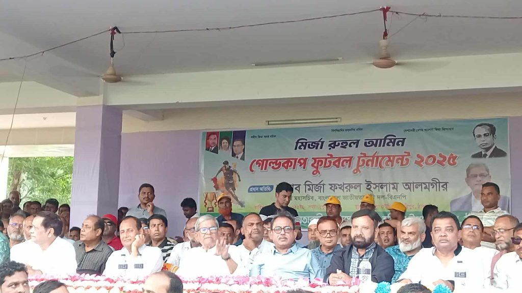 ঠাকুরগাঁওয়ের হরিপুরে জাকজমকপূর্ণ আয়োজনের মধ্যদিয়ে মির্জা রুহুল আমিন গোল্ডকাপ ফুটবল টুনামেন্টের ফইনাল খেলা সর্ম্পণ হয়েছে। গতকাল বৃহস্পতিবার বিকাল ৪ টায় কারবাল মিনি ইস্টেডিয়ামে বেলুন ও পায়রা উড়িয়ে টুর্নামেন্টের ফইনাল খেলার উদ্ধোধন করেন বাংলাদেশ জাতীয়তাবাদী দলের মহাসচিব মির্জা ফখরুল ইসলাম আলমগীর। বাংলাদেশ জাতীয়তাবাদী সেচ্ছাসেবক দল হরিপুর উপজেলা শাখার আয়োজনে ফইনাল খেলা অনুষ্ঠানে সংগঠনের উপজেলা শাখার সভাপতি জাহাঙ্গীর আলমের সভাপতিত্বে বক্তব্য দেন,