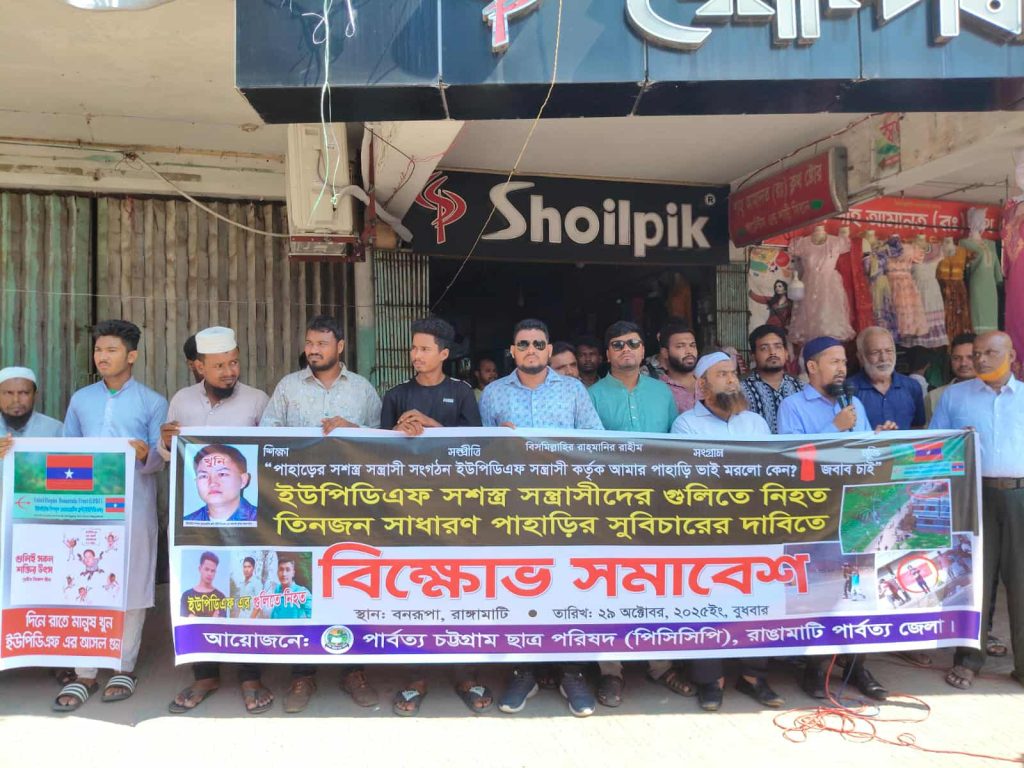 ইউপিডিএফের সশস্ত্র সন্ত্রাসীদের গুলিতে নিহত তিনজন সাধারণ পাহাড়ি যুবক হত্যার সুবিচারের দাবিতে (২৯ে অক্টোবর) বুধবার সকালে শহরের বনরূপা আলিফ মার্কেটের সামনে পার্বত্য চট্টগ্রাম ছাত্র পরিষদ (পিসিসিপি) রাঙামাটি জেলা শাখার পক্ষ থেকে এক বিক্ষোভ সমাবেশ অনুষ্ঠিত হয়।