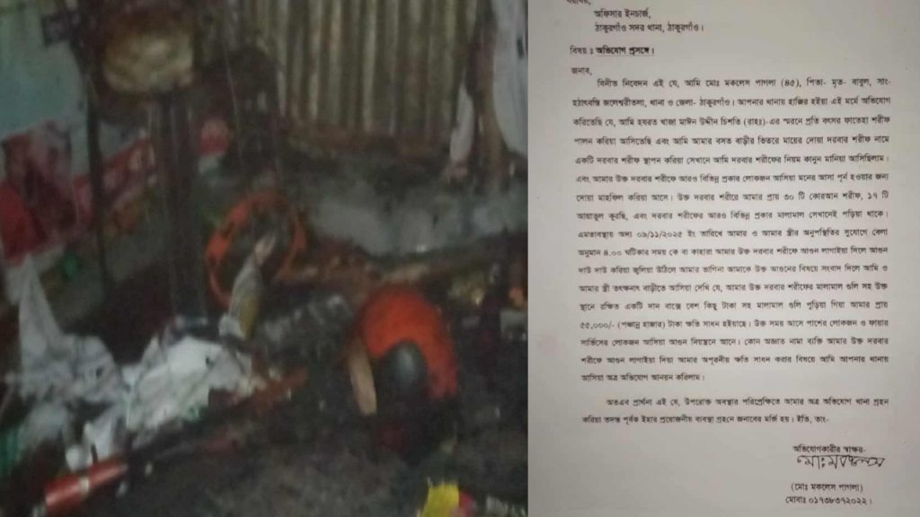 ঘটনাস্থল ও অভিযোগ সুত্রে জানা যায়, আমরা বাসায় কেউ ছিলাম না, আমার মা কাজে গিয়েছিলো আমি আমার কর্ম স্থান স্ট্যান্ডে ছিলাম। হঠাৎ বিকেল শুনতে পাই আমার বাসায় অগ্নিকাণ্ডের ঘটনা ঘটে এমনতা অবস্থায় তখনি বাসায় গিয়ে দেখি আমার সয়ন ঘর ঠিক থাকলে-ও আমার মাজার শরীফ দরবার পুরে ছাই হয়ে গেছে। কে বা কাঁহারা আমার মাজার শরীর এ-ই ভাবে ধ্বংস করে দিলো, এটা উদ্দেশ্য পরিকল্পিত ভাবে আগুন লাগিয়ে দেওয়া হয়েছে বলে ঠাকুরগাঁও সদর থানায় একটি অভিযোগ দায়ের করেন সেই মাজার পরিচালক মোকলেস হোসাইন।