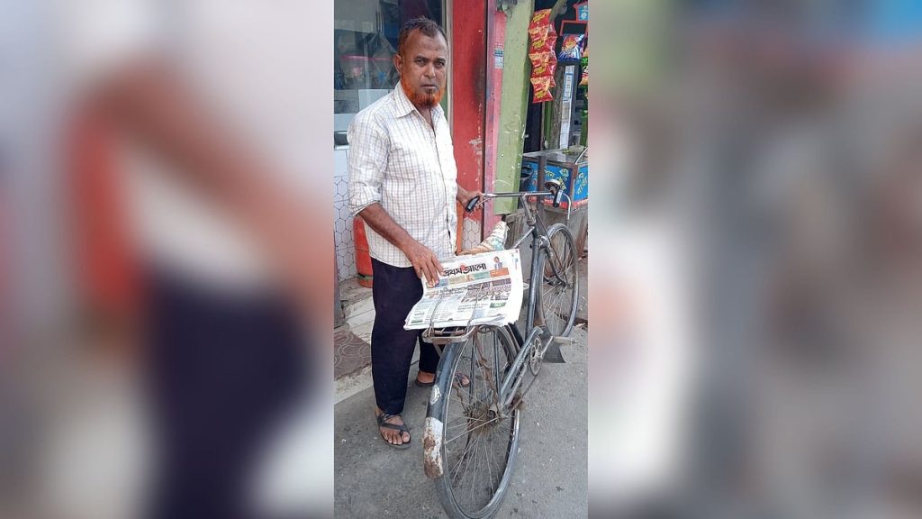 ঝড়–বৃষ্টি–শীত উপেক্ষা করে ৩৪ বছর ধরে পত্রিকা বিলি করছেন নুর ইসলাম।