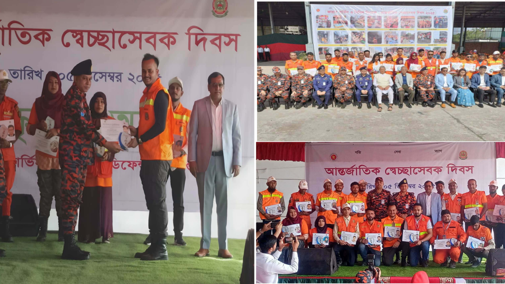 শুক্রবার (৫ ডিসেম্বর) রূপগঞ্জের পূর্বাচল মাল্টিপারপাস ট্রেনিং কমপ্লেক্সে আয়োজিত বর্ণাঢ্য অনুষ্ঠানে বাংলাদেশ ফায়ার সার্ভিস ও সিভিল ডিফেন্সের মহাপরিচালক ব্রিগেডিয়ার জেনারেল মুহাম্মদ জাহেদ কামাল স্বেচ্ছাসেবকদের হাতে সম্মাননা ক্রেস্ট ও সনদপত্র তুলে দেন।