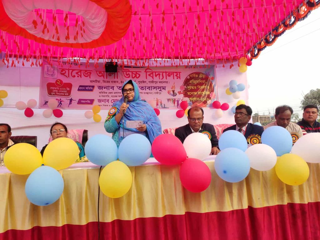 হারেজ আলী উচ্চ বিদ্যালয়ের বার্ষিক ক্রীড়া প্রতিযোগিতা, পুরস্কার বিতরণ ও মনোজ্ঞ সাংস্কৃতিক অনুষ্ঠান গত ০২ ফেব্রুয়ারি ২০২৬ তারিখ বিকালে বিদ্যালয় প্রাঙ্গনে অনুষ্ঠিত হয়। এ ছাড়া এস এস সি পরীক্ষা-২০২৫ এ এ+ প্রাপ্ত মেধাবী শিক্ষার্থীদের ক্রেস্ট প্রদান করা হয়। হারেজ আলী উচ্চ বিদ্যালয়ের প্রধান শিক্ষক মোঃ আবদুর রশিদের সভাপতিত্বে ও সহকারী শিক্ষিকা তাহমিনা বেগম বেবীর সঞ্চালনায় উক্ত অনুষ্ঠানে প্রধান অতিথির আসন অলংকৃত করেন তানিয়া তাবাসসুম, বিদ্যালয়ের সভাপতি ও অতিরিক্ত জেলা প্রশাসক (উন্নয়ন ও মানব সম্পদ ব্যবস্থাপনা) গাজীপুর। উক্ত অনুষ্ঠানে অংশ গ্রহণ করেন সহকারী প্রধান শিক্ষক খায়রুন নাহার, শিক্ষক প্রতিনিধি সহকারী শিক্ষক কানাই লাল দাস, সহকারী শিক্ষিক আবুল খায়ের, খোকন দাস, মোঃ ওয়াহিদ মুরাদ, আবদুল হালিম, সহকারী শিক্ষিকা রোকশানা পারভীন, রায়হান আক্তার, সাজেদা আক্তার, জৈগুন নেছা,শাহনাজ বেগম, অভিভাবক সদস্য আলী মুনসুর ও সাবেক অভিভাবক সদস্য মোঃ মামুন মোল্লা প্রমূখ। সভাপতির বক্তব্যে প্রধান শিক্ষক মোঃ আবদুর রশিদ বলেন, ২০০২ সালে বিদ্যালয়টি প্রতিষ্ঠিত হয়। অত্র বিদ্যালয়ের প্রতিষ্ঠাতা মরহুম হারেজ আলী মোল্লার কথা উল্লেখ করে তার স্মৃতির প্রতি তিনি শ্রদ্ধা জ্ঞাপন করেন। তার মতে, খেলাধুলা ছাত্র ছাত্রীদের শারীরিক, মানসিক ও চরিত্র গঠনে সহায়ক ভূমিকা পালন করে থাকে। তিনি বলেন, প্রতি বছর হারেজ আলী উচ্চ বিদ্যালয়ে ক্রীড়া অনুষ্ঠান পরিচালিত হয়ে আসছে। বিদ্যালয়ের নানাবিধ সমস্যার কথা উল্লেখ করে তিনি বলেন, অত্র বিদ্যালয়ে দীর্ঘ দিন যাবৎ বাউন্ডারি নেই, পাশে রেল লাইন, যে কোন সময় ছাত্র ছাত্রীদের দূর্ঘটনা হতে পারে। প্রধান ফটকে কোন গেট নেই। এ ব্যাপারে তিনি প্রধান অতিথির সুদৃষ্টি কামনা করেন। প্রধান অতিথি তানিয়া তাবাসসুম তার বক্তব্যে ছাত্র ছাত্রীদের উদ্দেশ্যে বলেন, তোমাদের লেখা পড়ার প্রতি গভীর মনোযোগ দিতে হবে, সৎ হতে হবে ও খেলাধুলার প্রতি আগ্রহ সৃষ্টি করতে হবে। জাতি হিসাবে তোমাদেরকে যোগ্য হিসাবে গড়ে তুলতে হবে। আগামী দিনে তোমরা জাতির নেতৃত্ব দিবে। অনুষ্ঠানের সভাপতি প্রধান শিক্ষক আবদুর রশিদের দাবীর প্রতি দৃষ্টি আকর্ষন করে তিনি বলেন, আমি এই সকল সমস্যা সমাধানে আন্তরিক ভাবে চেষ্টা করবো। পরিশেষে তিনি বিদ্যালয়ের প্রধান শিক্ষক, সকল সহকারী শিক্ষক/শিক্ষিকাবৃন্দ, অভিভাবকবৃন্দ ও ছাত্র ছাত্রীদের ধন্যবাদ জানিয়ে তার বক্তব্য সমাপ্ত করেন। আলোচনার পর প্রধান অতিথি বিজয়ী খেলোয়াড়দের মাঝে পুরস্কার বিতরণ করেন এবং সন্ধার পরে মনোজ্ঞ সাংস্কৃতিক অনুষ্ঠান পরিবেশিত হয়।