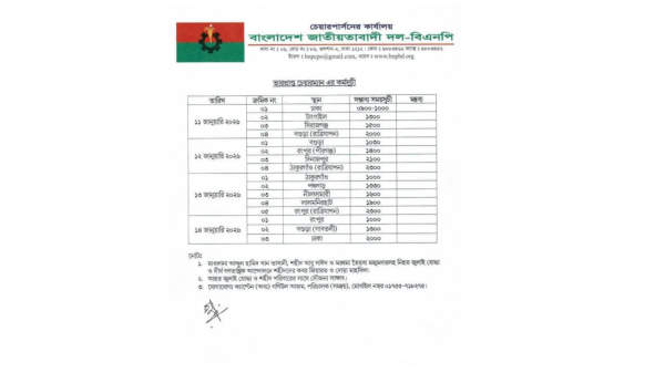 বাংলাদেশ জাতীয়তাবাদী দল—বিএনপির ভারপ্রাপ্ত চেয়ারম্যান তারেক রহমানের ধারাবাহিক কর্মসূচির তালিকা প্রকাশ করা হয়েছে। দলটির চেয়ারপারসনের কার্যালয় থেকে প্রকাশিত এক বিজ্ঞপ্তিতে জানানো হয়, আগামী ১১ থেকে ১৪ জানুয়ারি পর্যন্ত দেশের বিভিন্ন